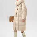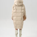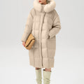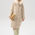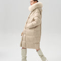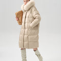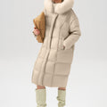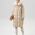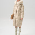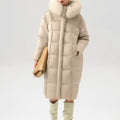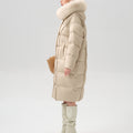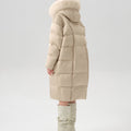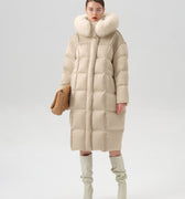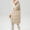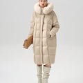 This luxurious down jacket is crafted with a 90% duck down fill for exceptional warmth and comfort. It features elegant leather splicing on the shoulders, adding a refined and modern touch to the overall design. The jacket is topped with a large real fox fur hood that not only enhances its aesthetic appeal but also provides extra protection against the cold. The straight, long silhouette ensures full coverage and a chic look, making this jacket a perfect blend of functional warmth and high-end style for winter.