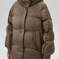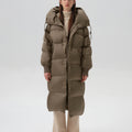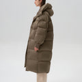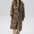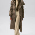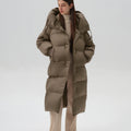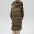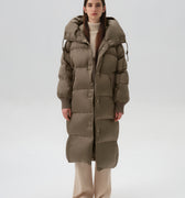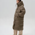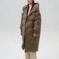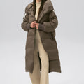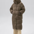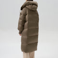 This long, hooded down jacket is designed for ultimate warmth and style, featuring a 90% premium duck down filling for optimal insulation during cold weather. Its oversized fit and adjustable hood provide both comfort and protection, while the ribbed cuffs and sleek silhouette add a refined, modern touch. The jacket's minimalistic design ensures it pairs effortlessly with both casual and chic outfits, making it a versatile essential for your winter wardrobe. Stay cozy and stylish with this perfect blend of fashion and function.