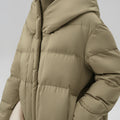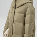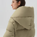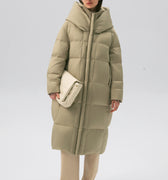 This elegantly designed down jacket offers superior warmth and comfort, filled with 90% premium duck down for lightweight insulation against the cold. Its oversized silhouette and high, protective collar give it a modern yet functional aesthetic, perfect for winter days. A standout feature is the cozy knitted chin guard, ensuring added comfort and softness around the neck and face. With its neutral tone and minimalist design, this jacket provides a sophisticated touch while keeping you warm in style.