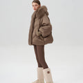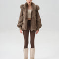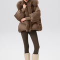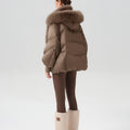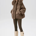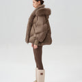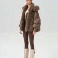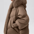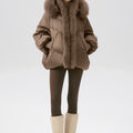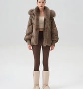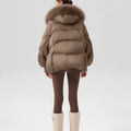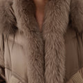 This luxurious down jacket is a perfect blend of high-end style and ultimate warmth, featuring a voluminous fox fur-lined hood and trim that add an extra touch of elegance and sophistication. Filled with 90% premium duck down, it offers exceptional insulation while remaining lightweight and comfortable. The plush fox fur detail not only elevates the overall look but also provides added warmth and a glamorous edge to the jacket. With its oversized silhouette, ribbed cuffs, and quilted design, this jacket is both a practical and stylish statement piece for the winter season.