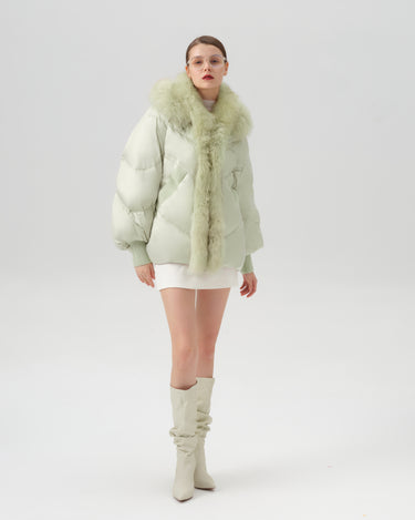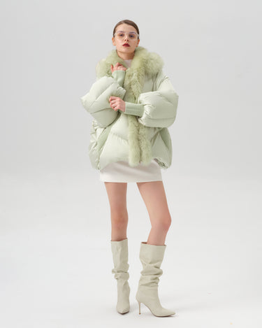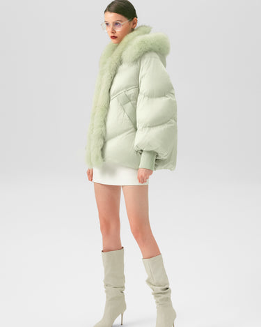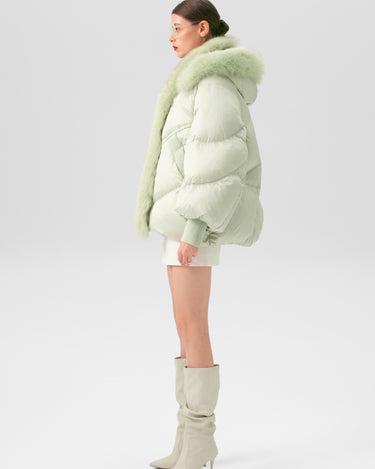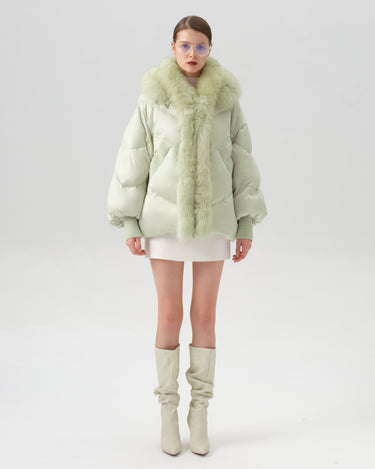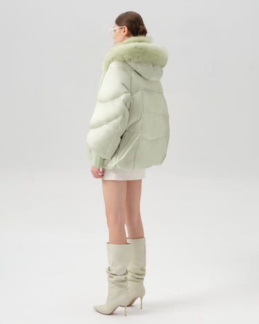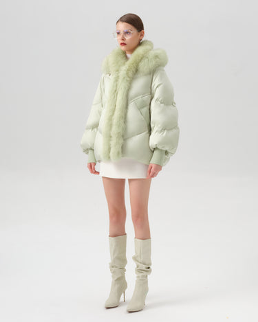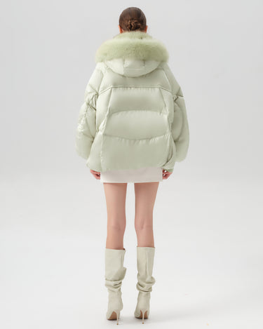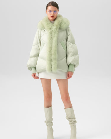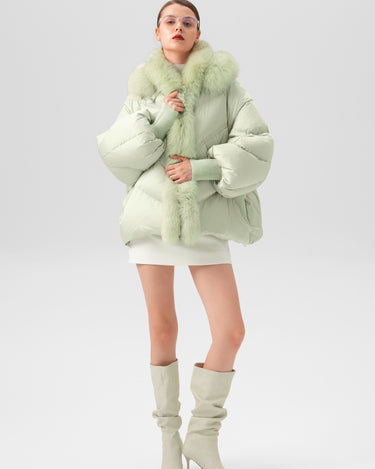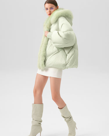 This luxurious down jacket is a perfect blend of high-end style and ultimate warmth, featuring a voluminous fox fur-lined hood and trim that add an extra touch of elegance and sophistication. Filled with 90% premium duck down, it offers exceptional insulation while remaining lightweight and comfortable. The plush fox fur detail not only elevates the overall look but also provides added warmth and a glamorous edge to the jacket. With its oversized silhouette, ribbed cuffs, and quilted design, this jacket is both a practical and stylish statement piece for the winter season.