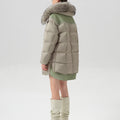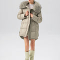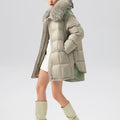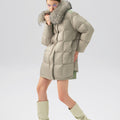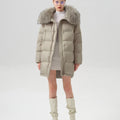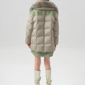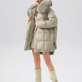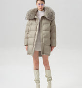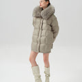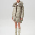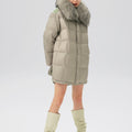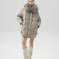 This luxurious down jacket is filled with 90% premium duck down, offering exceptional warmth and insulation for cold weather. The design features an oversized detachable fur collar for added elegance, and unique leather splicing on the bottom and back, which elevates the overall look with a modern, textured contrast. Its high-gloss finish, structured quilting, and mid-length cut ensure both comfort and style. Perfect for those seeking a blend of practicality and sophistication, this jacket keeps you cozy while making a fashion-forward statement.