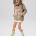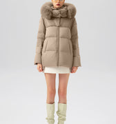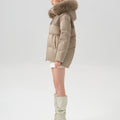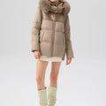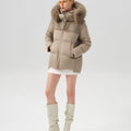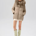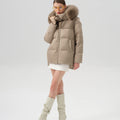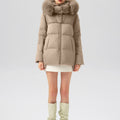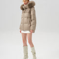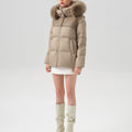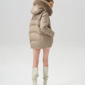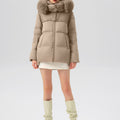 This premium down jacket blends both style and functionality, offering 90% duck down insulation for superior warmth even in extreme cold. The design features leather splicing on the shoulders, adding a rugged yet refined contrast to the smooth, puffy body of the jacket. The luxurious fur hood elevates the look while providing additional protection against the elements. The silhouette and detailing echo the classic yet bold aesthetic, combining durability with high-end elegance. Perfect for winter wear, it offers ultimate comfort and timeless appeal.