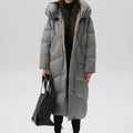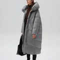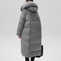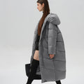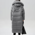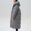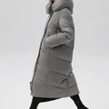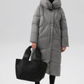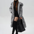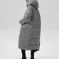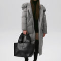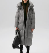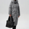 This sophisticated down jacket offers both style and warmth with its premium 90% duck down filling, ensuring lightweight insulation for the coldest days. The design features a unique knitting splicing detail on the pockets, adding a textured contrast to the sleek, quilted exterior. Its oversized collar and hood provide extra protection against harsh weather, while the long, streamlined silhouette creates a modern, flattering look. With hidden side pockets and a chic, minimalist aesthetic, this jacket is perfect for elevating your winter wardrobe.