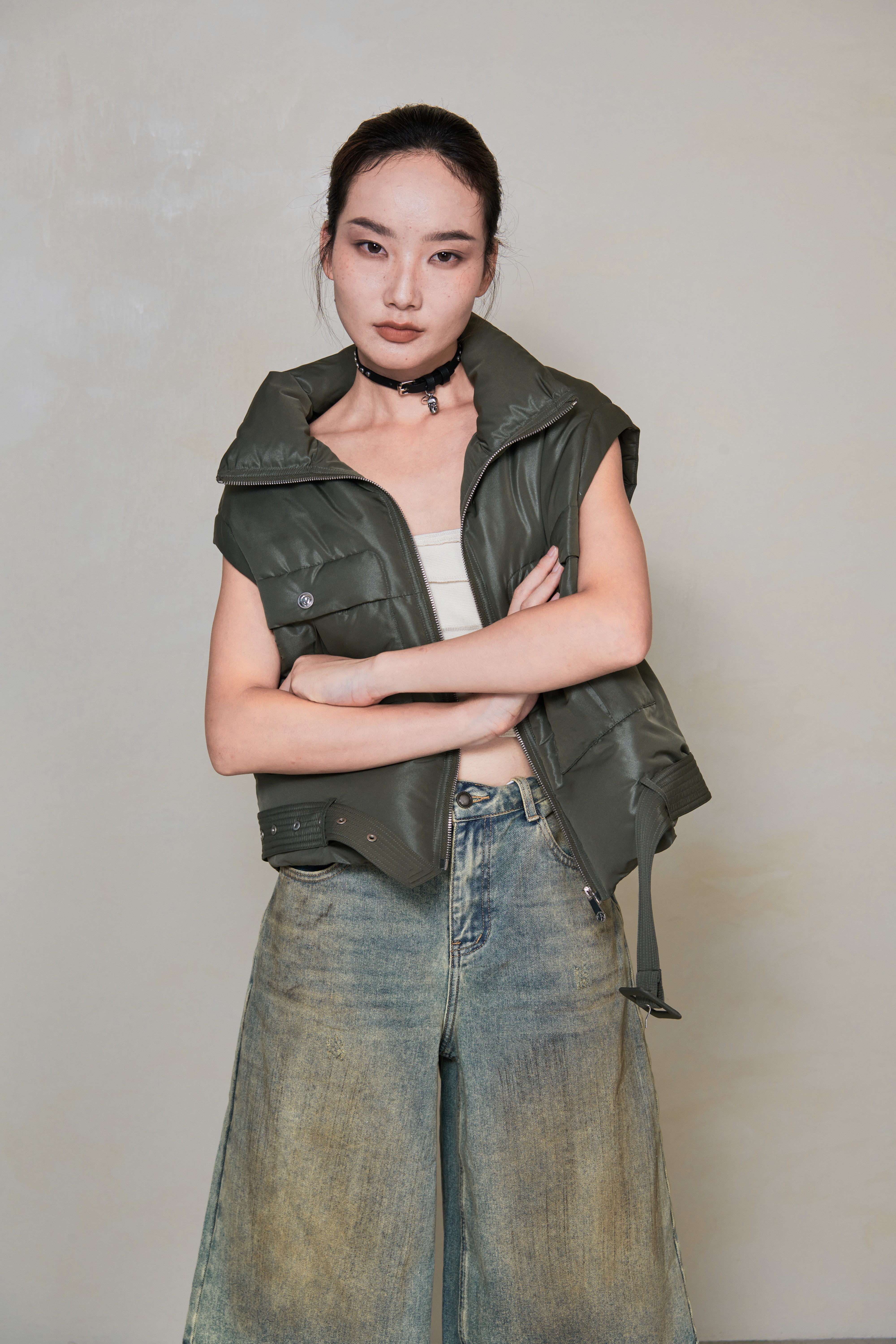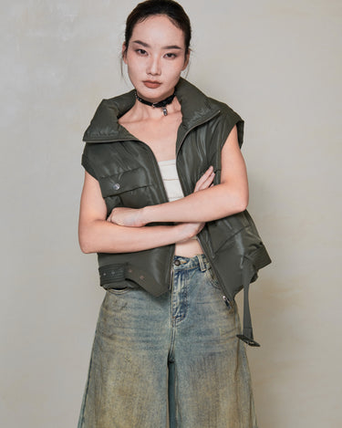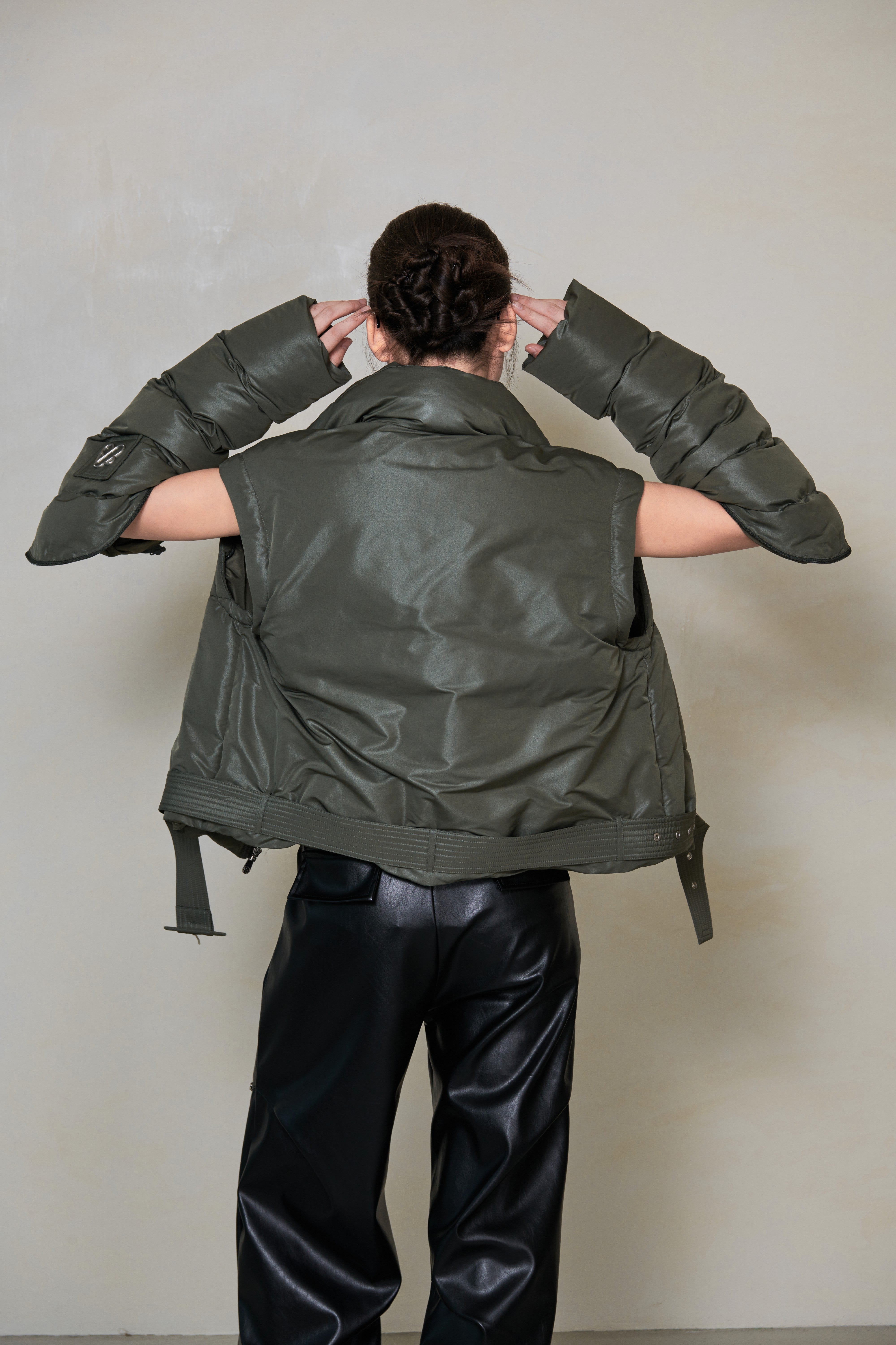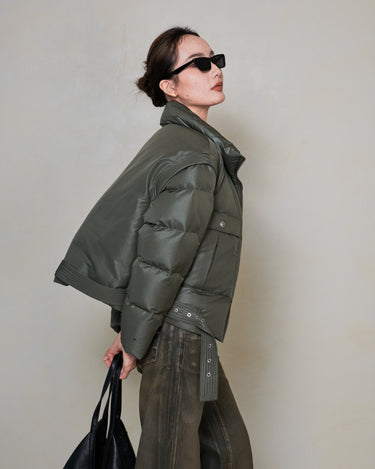 A modern essential with a sculpted edge. Crafted with 90% premium white duck down, this puffer features a diamond-weave fabric that catches light with a subtle shimmer. The detachable sleeves convert it into a vest, while the removable hem belt lets you adjust the silhouette from relaxed to structured. Finished with the NOMADAPT signature metal sleeve badge for a clean, refined touch.