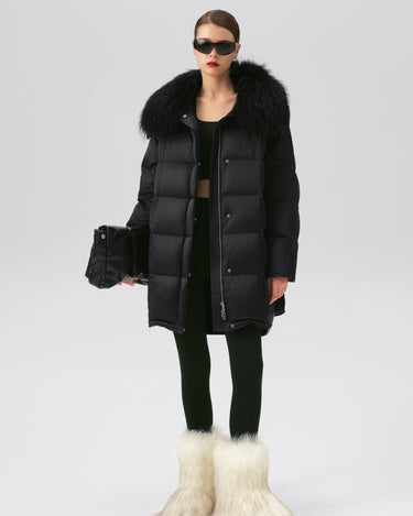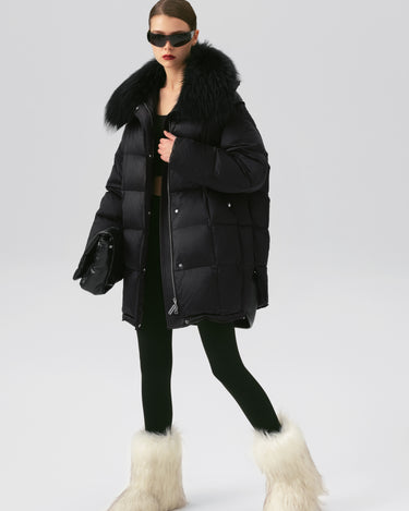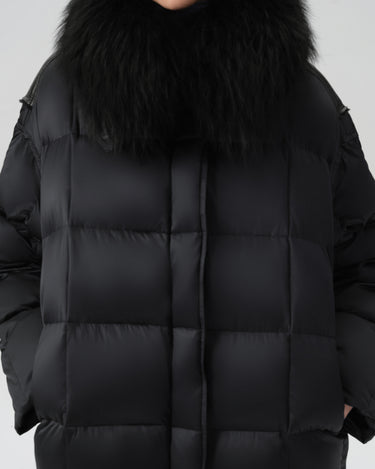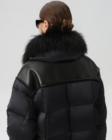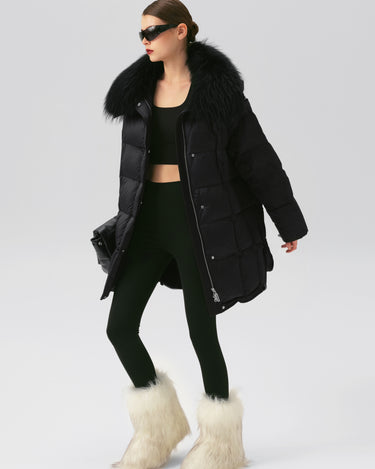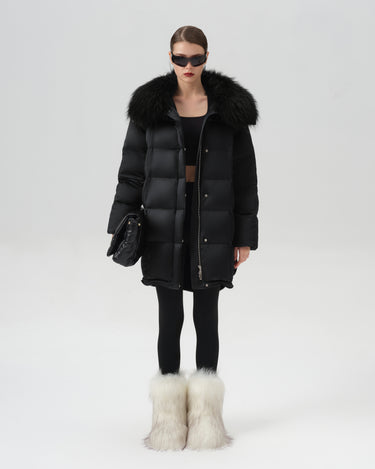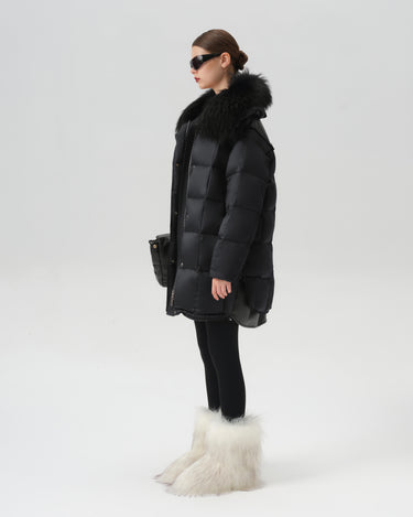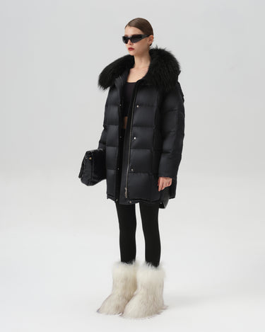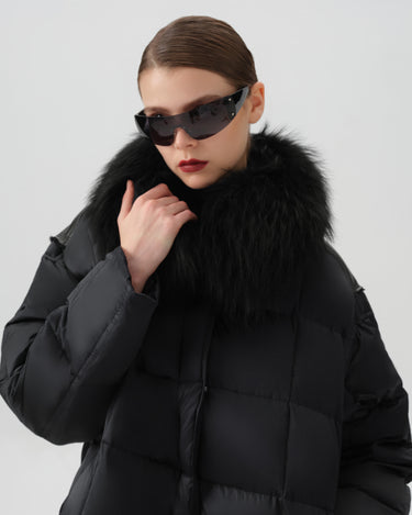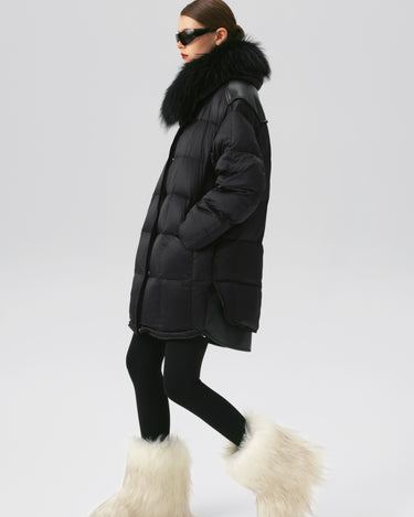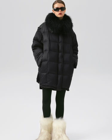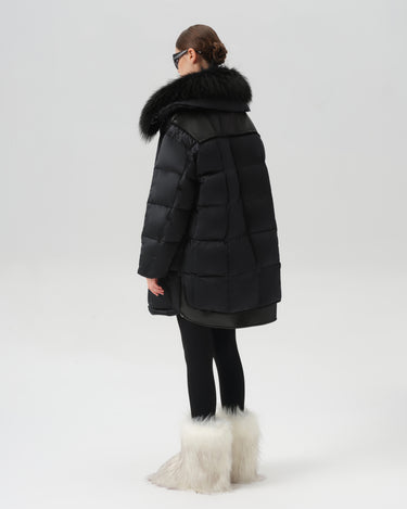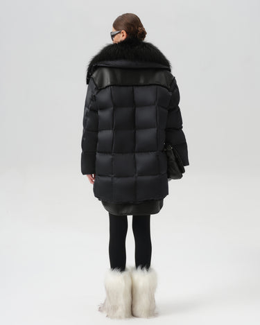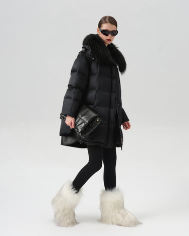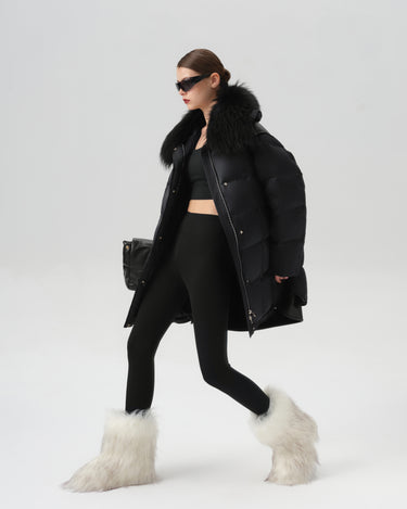 This luxurious down jacket is filled with 90% premium duck down, offering exceptional warmth and insulation for cold weather. The design features an oversized detachable fur collar for added elegance, and unique leather splicing on the bottom and back, which elevates the overall look with a modern, textured contrast. Its high-gloss finish, structured quilting, and mid-length cut ensure both comfort and style. Perfect for those seeking a blend of practicality and sophistication, this jacket keeps you cozy while making a fashion-forward statement.