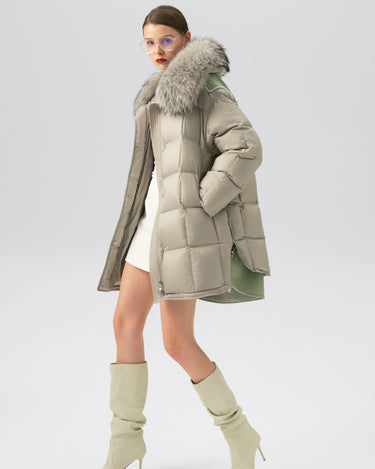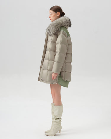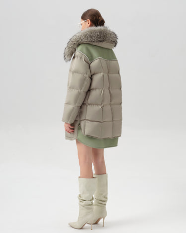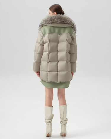 This luxurious down jacket is filled with 90% premium duck down, offering exceptional warmth and insulation for cold weather. The design features an oversized detachable fur collar for added elegance, and unique leather splicing on the bottom and back, which elevates the overall look with a modern, textured contrast. Its high-gloss finish, structured quilting, and mid-length cut ensure both comfort and style. Perfect for those seeking a blend of practicality and sophistication, this jacket keeps you cozy while making a fashion-forward statement.